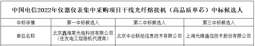 ICC訊 6月25日,中國(guó)電信陽光采購(gòu)網(wǎng)公布2022年儀器儀表集中采購(gòu)項(xiàng)目干線光纖熔接機(jī)(高品質(zhì)單芯)中標(biāo)候選人,其中,住友電工熔接機(jī)的代理商北京鑫海萊光電科技有限公司為第一中標(biāo)候選人,北京中合聯(lián)拓信息技術(shù)有限公司、上海光維通信技術(shù)股份有限公司分別為第二、第三中標(biāo)候選人。