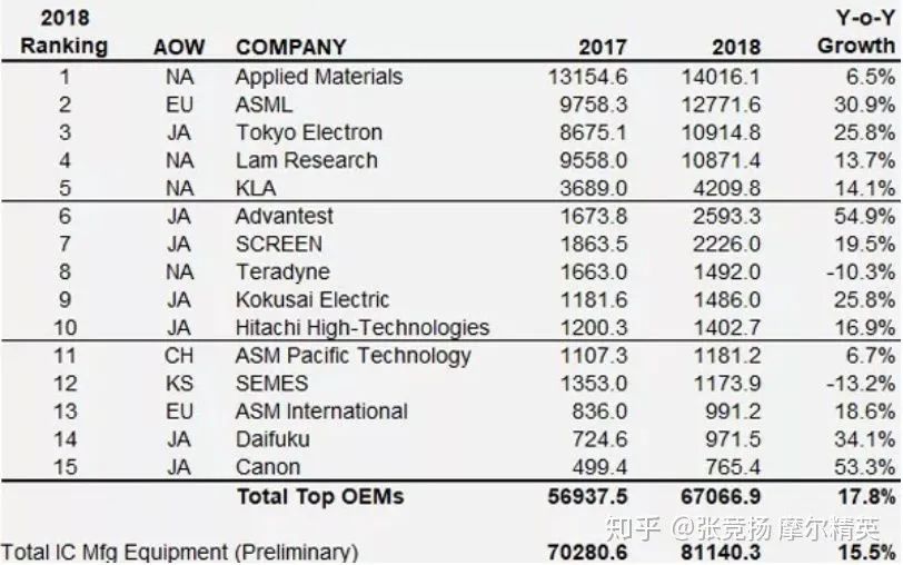 2018年全球15大半導(dǎo)體制造設(shè)備制造商。銷售單位為百萬美元(來源:VLS IResearch)