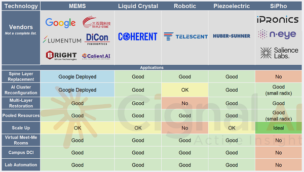 最新報告指出,數(shù)據(jù)中心內(nèi)的OCS用例已遠(yuǎn)遠(yuǎn)超出谷歌最初的應(yīng)用范圍。運營商正在實施和評估OCS,用于縱向擴(kuò)展(Scale-up)網(wǎng)絡(luò)和后端網(wǎng)絡(luò)、資源池化與解耦,以及園區(qū)數(shù)據(jù)中心互聯(lián),其中可靠性已成為AI級部署的決定性要求。多種技術(shù)方案——如MEMS(微機(jī)電系統(tǒng))、液晶、壓電、機(jī)器人和硅光子技術(shù)——均旨在滿足不同端口數(shù)、速度和損耗要求的組合。