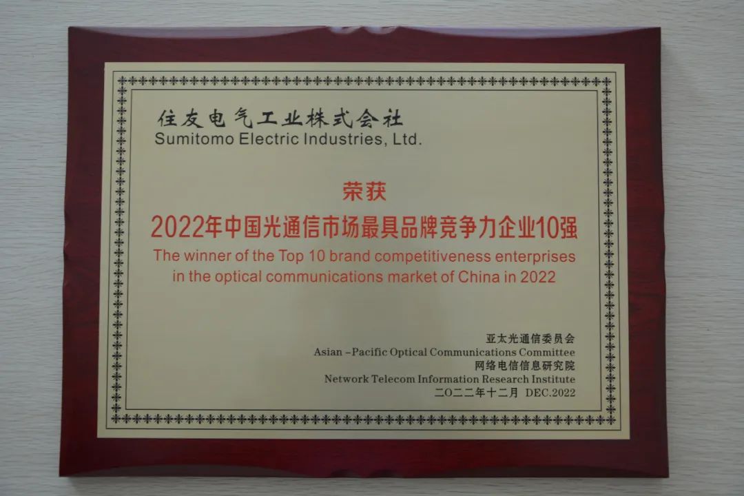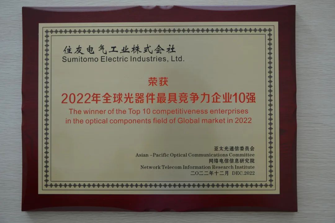 ICC訊 近日,由亞太光通信委員會和網(wǎng)絡(luò)電信信息研究院聯(lián)合主辦的《全球|中國光通信最具競爭力企業(yè)10強》評選活動,正式發(fā)布2022年最新十強榜單。住友電工共榮獲:
