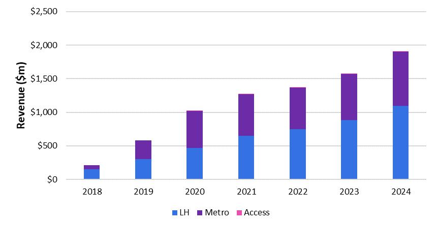 400G+被定義為能夠進(jìn)行400G或更高數(shù)據(jù)速率操作的任何收發(fā)器。400G+市場利用了供應(yīng)商的高性能相干DSP。如今,由于高性能DSP的尺寸和耗電,市場需求主要由嵌入式而非可插拔式產(chǎn)品所滿足。預(yù)計(jì)今年城域網(wǎng)部署的增長速度將超過長途網(wǎng)絡(luò)市場,但是到2021年,長途網(wǎng)絡(luò)市場升級到600G和800G技術(shù)的速度將加快。