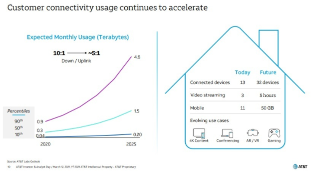 AT&T預(yù)計月度數(shù)據(jù)使用量還將繼續(xù)攀升。到2025年,中級用戶的使用量預(yù)計將上升至每月1.5T。該運營商還發(fā)現(xiàn),數(shù)據(jù)需求將變得越來越對稱,下行與上行的比例將從目前的10:1上升至2025年的5:1左右。