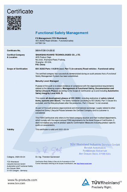 華為ADS獲得汽車行業(yè)功能安全管理體系A(chǔ)SIL D認(rèn)證證書