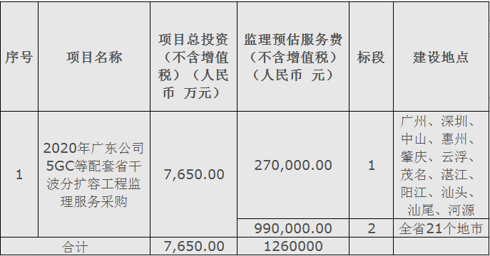 ICC訊(編輯:Anton)中國電信股份有限公司廣東分公司發(fā)布公告,招標(biāo)2020年廣東公司5GC等配套省干波分?jǐn)U容工程監(jiān)理服務(wù)采購(標(biāo)段一、二)。本項(xiàng)目劃分為2個(gè)標(biāo)段,標(biāo)段一最高投標(biāo)限價(jià)270000元,標(biāo)段二最高投標(biāo)限價(jià)990000元。