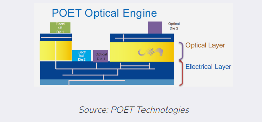 POET(https://poet-technologies.com/)開發(fā)了一種光學(xué)中介層,該中介層與標(biāo)準(zhǔn)制造技術(shù)集成,簡(jiǎn)化了光學(xué)和電氣組件在晶圓層面的集成。采用POET技術(shù),電氣器件仍在硅晶圓上互連,而光學(xué)器件則通過構(gòu)建在硅頂層的波導(dǎo)進(jìn)行互連。其目的是制造非常緊湊、完全集成的器件,在晶圓級(jí)別組合所有組件,而無需在后期進(jìn)行放置和互連。