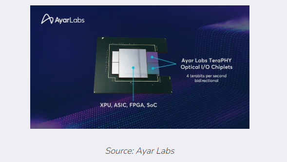 Ayar的首款產(chǎn)品TeraPHY芯片通過八個(gè)256Gbps硅光引擎,在封裝內(nèi)實(shí)現(xiàn)2Tbps帶寬,專為與交換機(jī)、GPU或其他處理器并排集成而設(shè)計(jì)。將光引擎與處理器共置可實(shí)現(xiàn)比傳統(tǒng)銅纜或可插拔光模塊更低的功耗、更低的延遲以及在更高速率下的更優(yōu)性能——這也是眾多公司競(jìng)相布局該領(lǐng)域的原因。CPO和LPO等方案也瞄準(zhǔn)這一應(yīng)用場(chǎng)景,但Ayar(及其他公司)的方案旨在將光學(xué)器件直接集成到處理器基板或多芯片模塊(MCM)上,更側(cè)重于AI節(jié)點(diǎn)內(nèi)部而非節(jié)點(diǎn)間的連接。