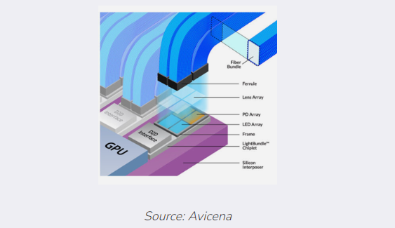 在Avicena的互連方案中,氮化鎵(GaN)LED陣列耦合到光纖束中,并垂直連接至基板。LED本質(zhì)上是低功耗光源,但運(yùn)行速度較低、傳輸距離較短。通過LED陣列,Avicena 可讓每個(gè)LED以較低速率運(yùn)行,從而實(shí)現(xiàn)高聚合互連速率。這需要一顆用于速率轉(zhuǎn)換(gearboxing)的芯片(會(huì)增加功耗和空間需求),但Avicena聲稱整體鏈路功耗仍低于其他方案。