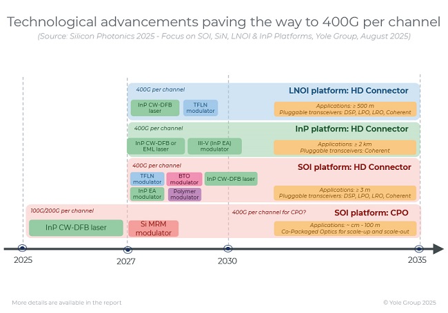 更高的每通道速率使單端口以太網(wǎng)速度達(dá)到3.2Tbps(甚至更高),同時實現(xiàn)更好的節(jié)能效果和激光器數(shù)量減少。更少的激光器降低了資本支出,簡化了供應(yīng)鏈,并減少了冷卻和供電的運營成本。在這一方向上,我們看到其他新平臺帶來的機(jī)遇。由于內(nèi)在材料特性,LNOI和InP成為未來高速鏈路的更直接解決方案。對可擴(kuò)展、高能效且具成本效益的光解決方案的需求,引發(fā)了SOI(含TFLN、BTO和聚合物)、LNOI和InP平臺之間的激烈競爭。每種平臺都具有獨特優(yōu)勢和挑戰(zhàn),共同塑造著IM-DD或Coherent-lite可插拔模塊的未來,并影響著更廣闊的光通信格局。