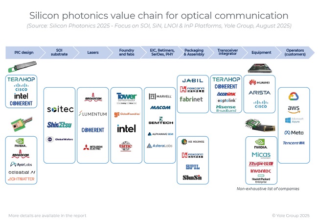 整個產(chǎn)業(yè)生態(tài)正圍繞多元化參與者形成:包括垂直整合巨頭(如旭創(chuàng)、思科、Marvell、博通、Coherent、Lumentum、新易盛)、初創(chuàng)企業(yè)/設(shè)計公司(Xphor、DustPhotonics、NewPhotonics、OpenLight、POET Technologies、Centera、AyarLabs、Lightmatter、Lightelligence、Nubis Communications)、研究機(jī)構(gòu)(如加州大學(xué)圣塔芭芭拉分校、哥倫比亞大學(xué)、斯坦福工程學(xué)院、麻省理工學(xué)院)、代工廠(如Tower Semiconductor、GlobalFoundries、英特爾、AMF、imec、臺積電、CompoundTek)以及設(shè)備供應(yīng)商(如應(yīng)用材料、ASML、Aixtron、ficonTEC、Mycronic Vanguard Automation、Shincron)。所有這些參與者共同推動著產(chǎn)業(yè)的顯著增長與多元化發(fā)展。