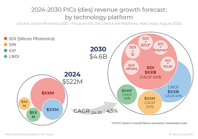 ICC訊 Yole發(fā)布最新報告稱,硅光子技術(shù)正驅(qū)動超高帶寬升級和人工智能網(wǎng)絡(luò)擴(kuò)展,其市場規(guī)模預(yù)計將從2024年的2.78億美元增長至2030年的27億美元,年復(fù)合增長率高達(dá)46%。