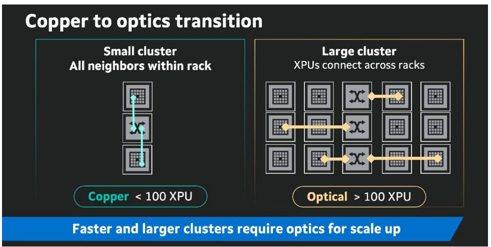 大規(guī)模 scale-up 網(wǎng)絡(luò)中銅纜連接有望向光互連轉(zhuǎn)換(數(shù)據(jù)來源:Marvell)
