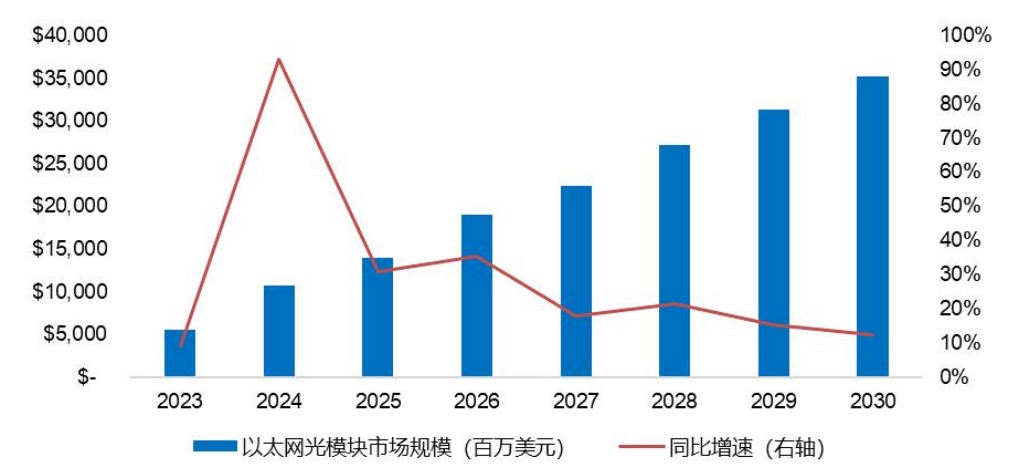 全球以太網(wǎng)光模塊市場規(guī)模及預(yù)測(百萬美元)(數(shù)據(jù)來源:Lightcounting)
