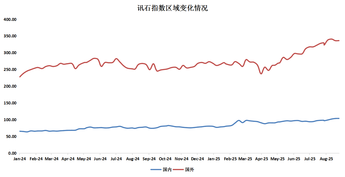 按地區(qū)劃分,截止到8月29日,ICC所統(tǒng)計的國內(nèi)通信指數(shù)為103.64,環(huán)比增長5.7%。國內(nèi)指數(shù)在平緩中呈現(xiàn)小幅增長趨勢。國外通信指數(shù)為336.22,較上月增長2.09%。國外股指在波折中,呈現(xiàn)向上增長的趨勢,增長趨勢放緩。