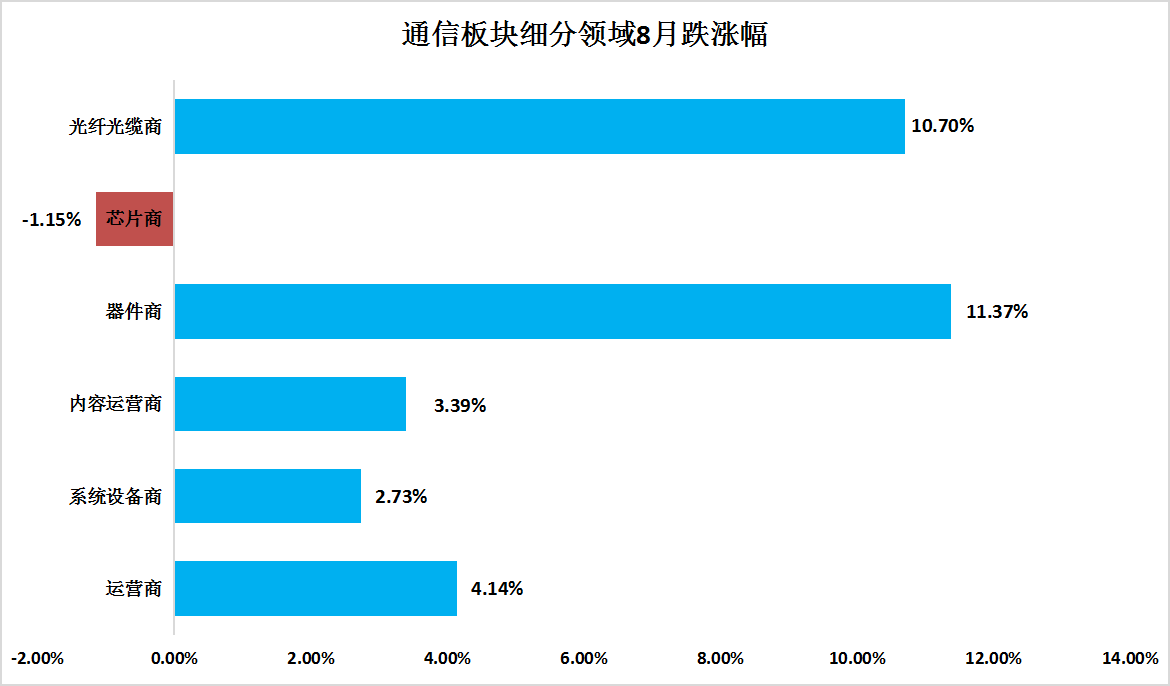 細分領(lǐng)域來看,ICC所統(tǒng)計的互聯(lián)網(wǎng)內(nèi)容運營商股指為189.5,相比上個月的183.29增長了3.39%。國內(nèi)外云廠商資本開支超預期,算力需求增長。運營商指數(shù)為131.39,7月底股指為125.98,環(huán)比增長4.14%,運營商傳統(tǒng)移動業(yè)務這增長放緩。設備商股指為135.85,相比上個月的132.24增長了2.73%。設備商業(yè)績持續(xù)增長,積極開拓新市場。器件商股指為347.42比上月的311.94增長了11.37%,國內(nèi)外主要器件廠商半年度業(yè)績顯示,受益于AI和算力需求的帶動,數(shù)據(jù)中心需求增長強勢,營收和利潤均實現(xiàn)大幅度增長。芯片商股指為1294.71,比上月的1309.76下滑1.15%,光纖光纜商股指為236.67,相比上月的213.79相比增長了10.7%。