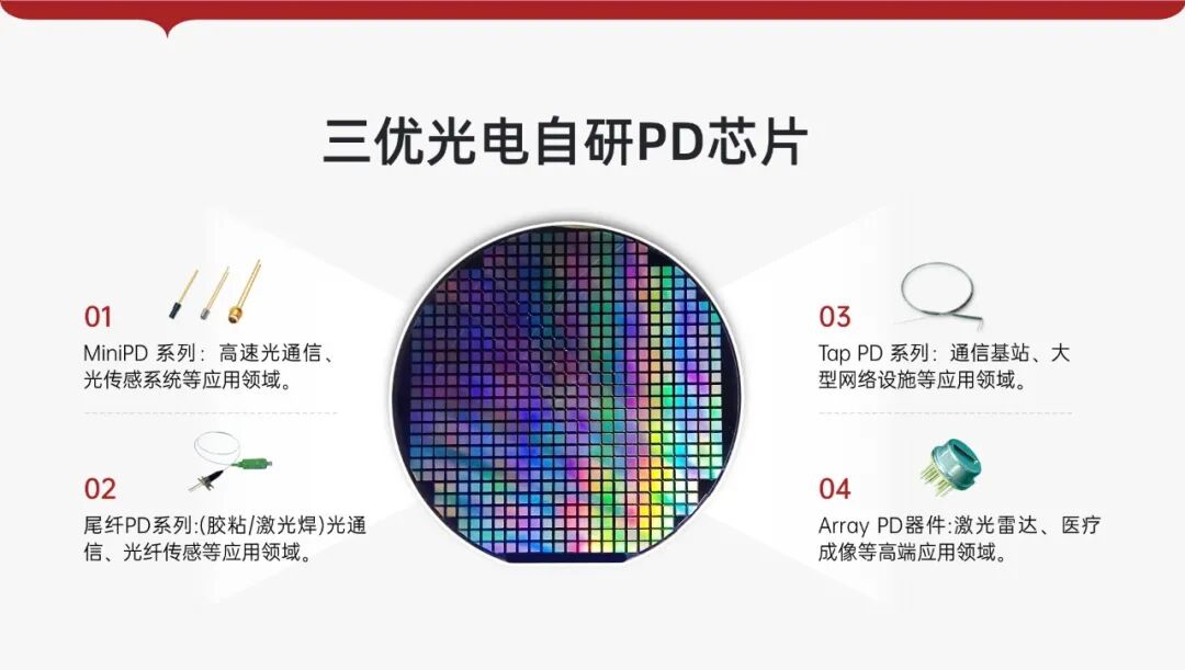 ICC訊 近日,三優(yōu)光電自研PD芯片及系列器件正式發(fā)布,標志著三優(yōu)光電在光通信領域推動關鍵光器件實現(xiàn)國產(chǎn)化替代。作為光通信產(chǎn)業(yè)鏈的關鍵一環(huán),PD芯片被喻為“光信號的翻譯官”,其性能直接決定光通信系統(tǒng)的傳輸效率與可靠性?;谧匝蠵D芯片的技術突破,三優(yōu)光電同步推出四大產(chǎn)品矩陣——MiniPD系列、尾纖PD(膠粘/激光焊)、Tap PD系列、Array PD器件,以“產(chǎn)品種類多元化+芯片國產(chǎn)化替代”雙重優(yōu)勢,產(chǎn)品主要應用在光纖放大器、光功率計、光信號數(shù)據(jù)傳輸、光傳感領域。