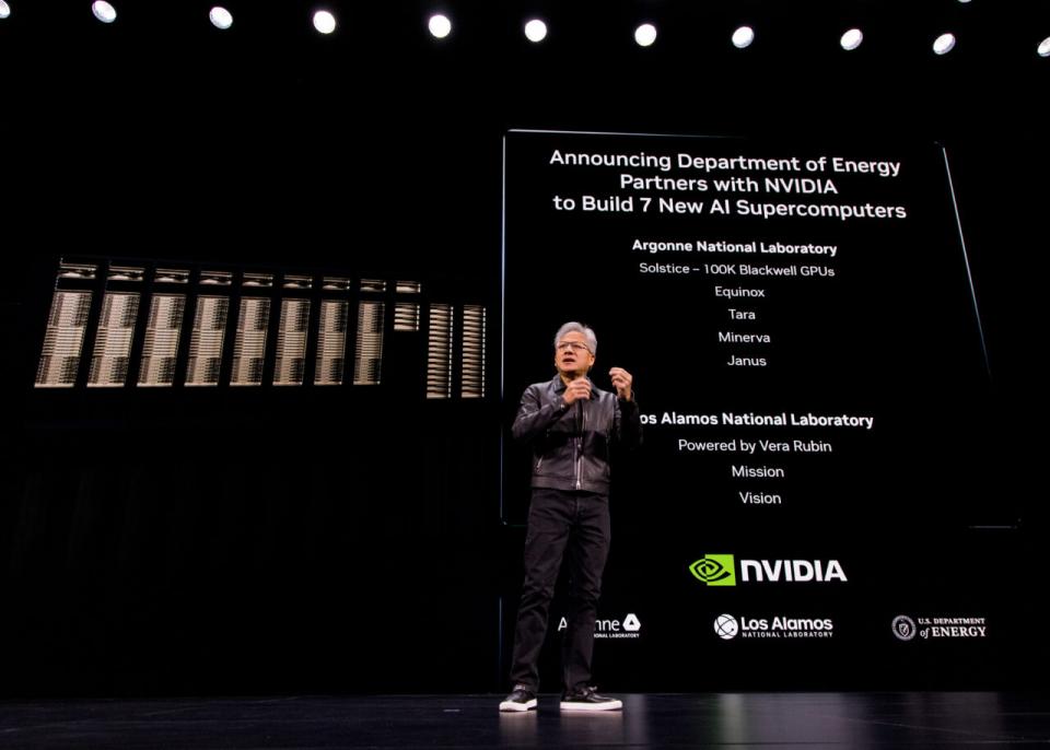 黃仁勛宣布,美國(guó)國(guó)家實(shí)驗(yàn)室正迎來(lái)由AI基礎(chǔ)設(shè)施驅(qū)動(dòng)的全新科研時(shí)代。英偉達(dá)與美國(guó)能源部(DOE)達(dá)成戰(zhàn)略合作,將共同建設(shè)七臺(tái)新一代超級(jí)計(jì)算機(jī),為未來(lái)科學(xué)研究提供強(qiáng)大算力支撐。