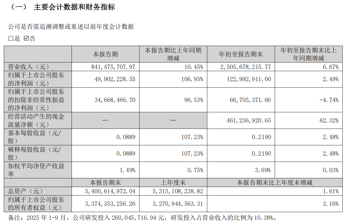 ICC訊 2025年10月27日,武漢銳科光纖激光技術(shù)股份有限公司(證券代碼:300747,以下簡稱“銳科激光”或“公司”)正式披露2025年第三季度報告。財報顯示,公司在前三季度實現(xiàn)營業(yè)收入25.06億元,同比增長6.67%;歸屬于上市公司股東的凈利潤1.23億元,同比增長2.49%;歸屬于上市公司股東的扣除非經(jīng)常性損益的凈利潤0.67億元,較往年相比略降4.74%。
