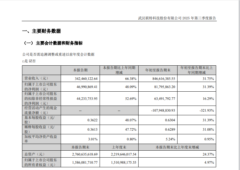 ICC訊 聯(lián)特科技發(fā)布2025年第三季度報告稱,2025年第三季度公司實現(xiàn)營業(yè)收入3.42億元,同比增長66.38%;歸屬于上市公司股東的凈利潤為4699萬元,同比增長48.09%。2025年前三季度公司實現(xiàn)營業(yè)總收入8.47億元,同比增長31.75%;歸母凈利潤8179.59萬元,同比增長31.39%。