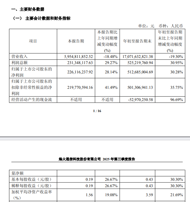 ICC訊 10月29日,烽火通信披露2025年三季報(bào)。烽火通信2025年第三季度實(shí)現(xiàn)營(yíng)收59.55億元,同比下降18.48%;歸母凈利潤(rùn)2.26億元,同比增長(zhǎng)28.14%。2025年前三季度營(yíng)收達(dá)170.72億元,同比下降19.30%;歸母凈利潤(rùn)5.13億元,同比增幅達(dá)30.28%。