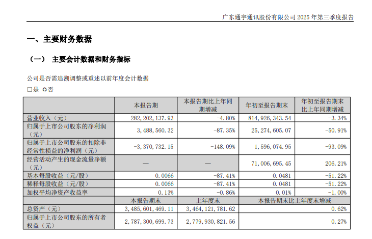 ICC訊 10月29日,通宇通訊公布2025年三季報(bào)。2025年前三季度通宇通訊營收為8.15億元,同比下降3.3%;歸母凈利潤為2527萬元,同比下降50.9%。其中第三季度,通宇通訊營收為2.82億元,同比下降4.8%;歸母凈利潤為349萬元,同比下降87.3%。