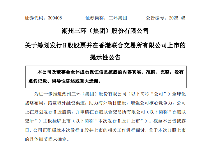 此外,三環(huán)集團(tuán)正在籌劃發(fā)行H股股票,并申請在香港聯(lián)交所主板掛牌上市。截至10月30日,三環(huán)集團(tuán)正積極就本次發(fā)行H股并上市的相關(guān)工作進(jìn)行商討,關(guān)于本次H股上市的具體細(xì)節(jié)尚未確定。