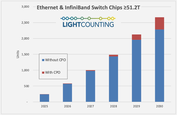 我們預(yù)估,包含共封裝光學(xué)(Co-packaged Optics,CPO)在內(nèi),以太網(wǎng)交換機芯片銷售額在2025至2030年間將以43%的年復(fù)合增長率增長。共封裝光學(xué)的影響因線性驅(qū)動可插拔光學(xué)(LPO)為每通道100G光模塊提供相近節(jié)能效果而有所延后。然而目前,每通道200G的共封裝光學(xué)交換機即將問世,首款產(chǎn)品為英偉達計劃于2025年下半年推出的InfiniBand共封裝光學(xué)交換機,博通TH6-Davisson將于2026年緊隨其后。英偉達的公告提升了我們的近期預(yù)測,我們預(yù)計至2030年,共封裝光學(xué)將為交換機芯片市場帶來約47億美元增量。