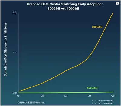 Crehan指出,800GbE的采用速度遠(yuǎn)快于400GbE。這一趨勢在品牌800GbE數(shù)據(jù)中心交換機(jī)上尤為明顯,迄今為止,其采用曲線幾乎是400GbE的近百倍。
